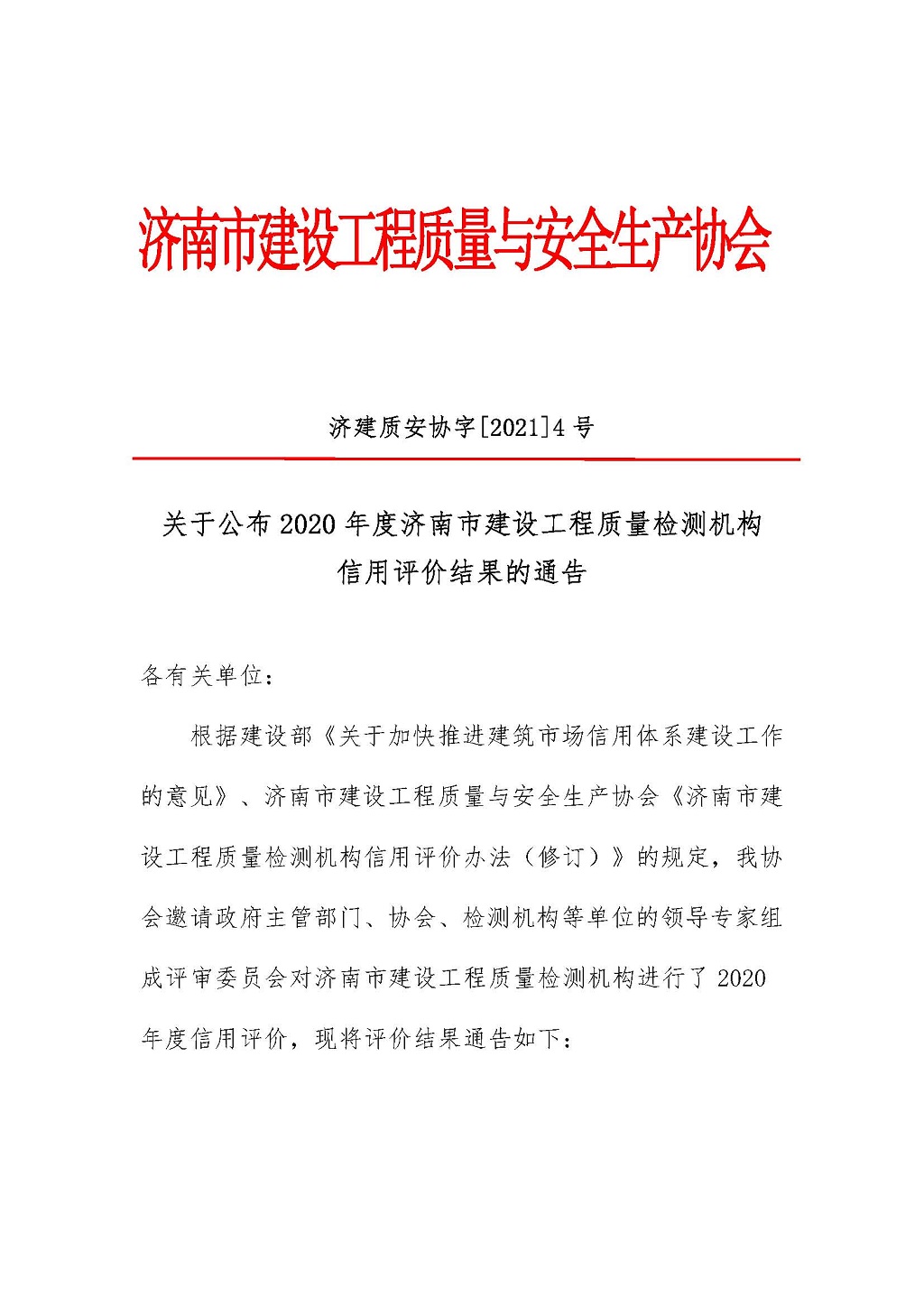 本次建设工程质量检测单位信用评价,是根据《济南市建筑市场主体信用评价管理办法》(济建发〔2020〕2号)、《<济南市建筑市场主体信用评价管理办法>评分表》(济建发〔2020〕4号)和《<济南市建筑市场主体信用评价管理办法>评分表补充通知》(济建建管字〔2020〕64号)、《关于加快推进建筑市场信用体系建设工作的意见》等要求,对2020年度全市建设工程质量检测单位的诚信行为的综合评价。