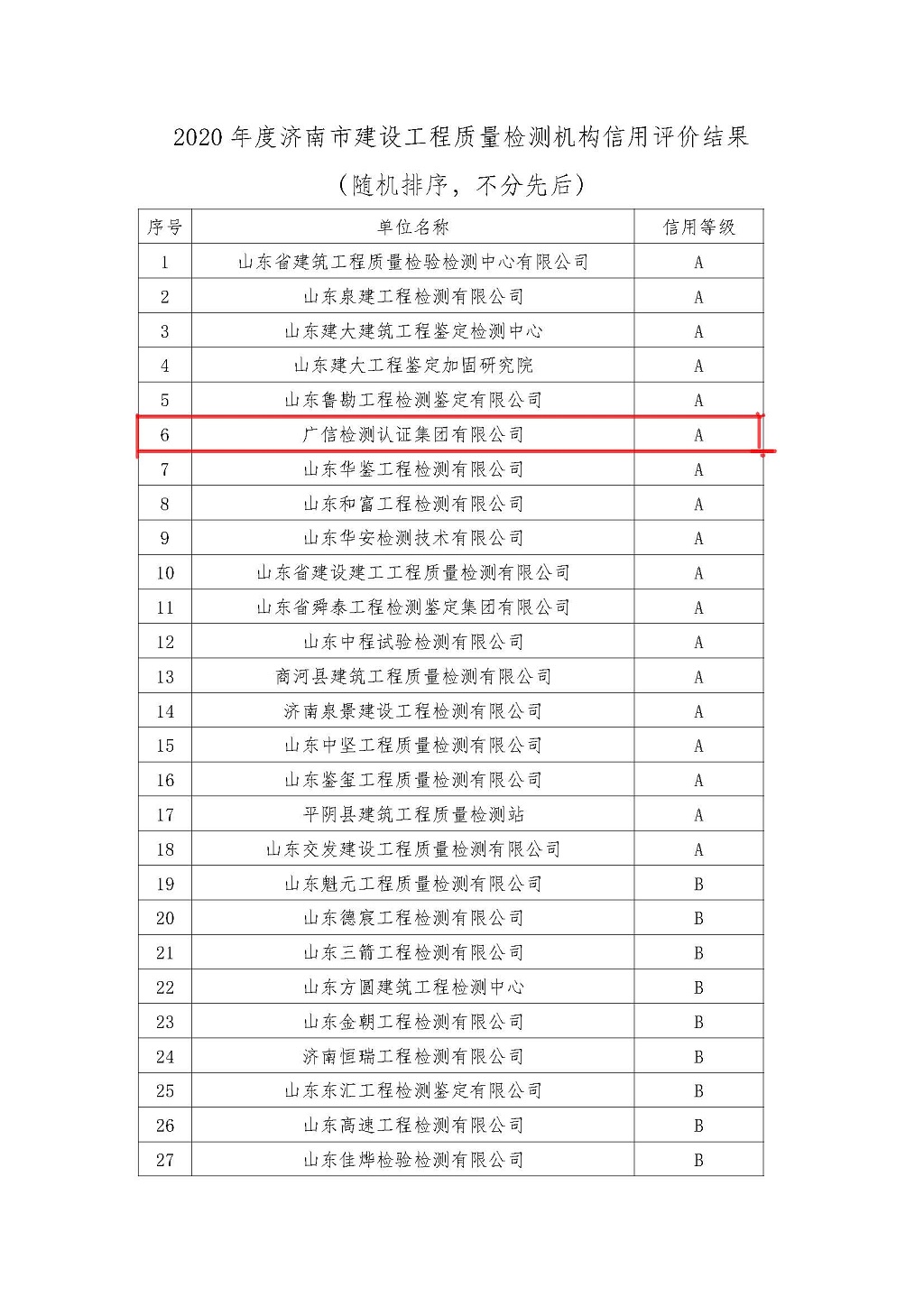 近日,济南市住房和城乡建设局公布了2020年下半年全市建筑市场主体信用评价结果,广信检测认证集团荣获2020年下半年全市质量检测机构信用评价获得AAA荣誉称号。同时,济南市建设工程质量与安全生产协会公布了2020年度济南市建设工程质量检测机构信用评价结果,广信检测认证集团荣获2020年度济南市建设工程质量检测机构信用评价A级检测单位。