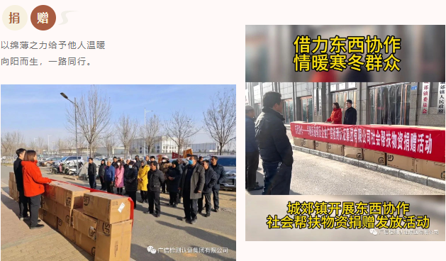 2023年12月13日上午,城郊镇举行东西协作济南市市中区兴隆街道帮扶捐赠物资发放仪式,发放仪式上,镇政府负责人对兴隆街道办事处帮扶和支持表示了感谢:“这次爱心企业广信集团为困难群体带来的捐赠物品都是生活必需品,一份份沉甸甸的心意,让居民们非常感动。收到物资的困难群众,他们每个人都内心激动。感谢企业对困难群众的帮助,感谢社会各界对他们的关心和关注”。