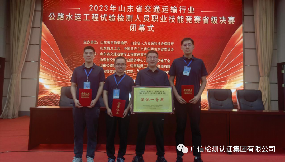 2023年9月22日,山东省交通运输行业公路水运工程试验检测人员职业技能竞赛的省级决赛在山东公路技师学院正式开始。此次竞赛由山东省交通运输厅、山东省人力资源保障厅、山东省总工会、中国共产主义青年团山东省委员会联合主办。来自全省16个市的交通运输系统检测机构、19个在建重点公路水运工程项目以及相关院校的43支代表队和129名选手参加了比赛。经过三天紧张有序的技能比拼,我公司派出的参赛团队:王孝龙、胥东东和王芊粤组合凭借扎实的技能、过硬的心理素质和良好的临场发挥,力压群雄,荣获团体一等奖和2项个人一等奖、1项个人二等奖的优异成绩!