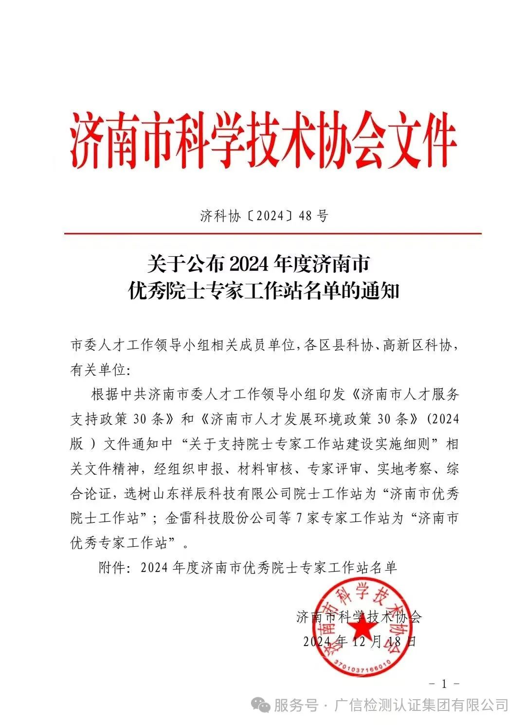 12月20日,济南市科学技术协会公布《关于公布2024年度济南市优秀院士专家工作站名单的通知》, 九州网页版登录页面被评为2024年度“济南市优秀专家工作站”。